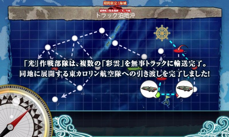 潜水艦と潜水空母の6隻編成で彩雲を届けました。潜水空母には瑞雲や紫雲を積みました。紫雲は正月任務で1つとっておいたのが活躍してくれました。