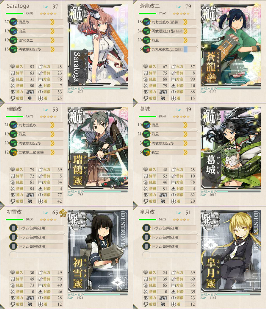 機動部隊で攻略した分輸送量が少なく出撃回数が多くなりました。大破撤退はそこまで多くなかったもののボスマスで撃ち漏らしA勝利できないことが何度かあってしんどかったです。ドロップにも恵まれなかったので余計に作業のような感じになってしまいました。