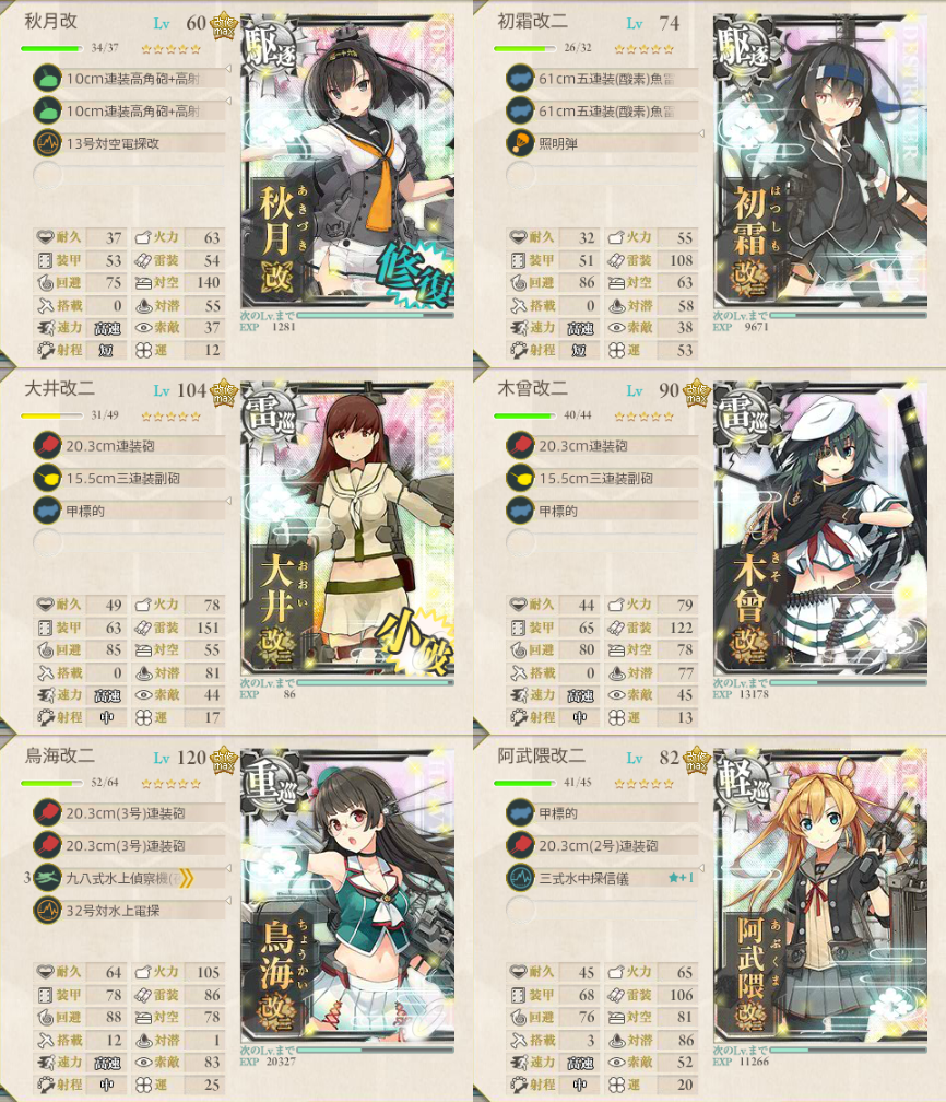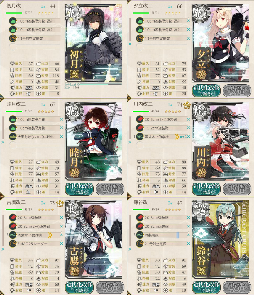 第一艦隊に比べると練度高めです。夜戦火力の高い夕立と大発が積める睦月改二でバランスをとったつもり。